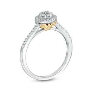 This classic style is crafted in 10K white gold, with a diamond composite that sparkles in a halo of diamonds. This ring is stunning with 1/4 carat diamonds and brilliant polish.